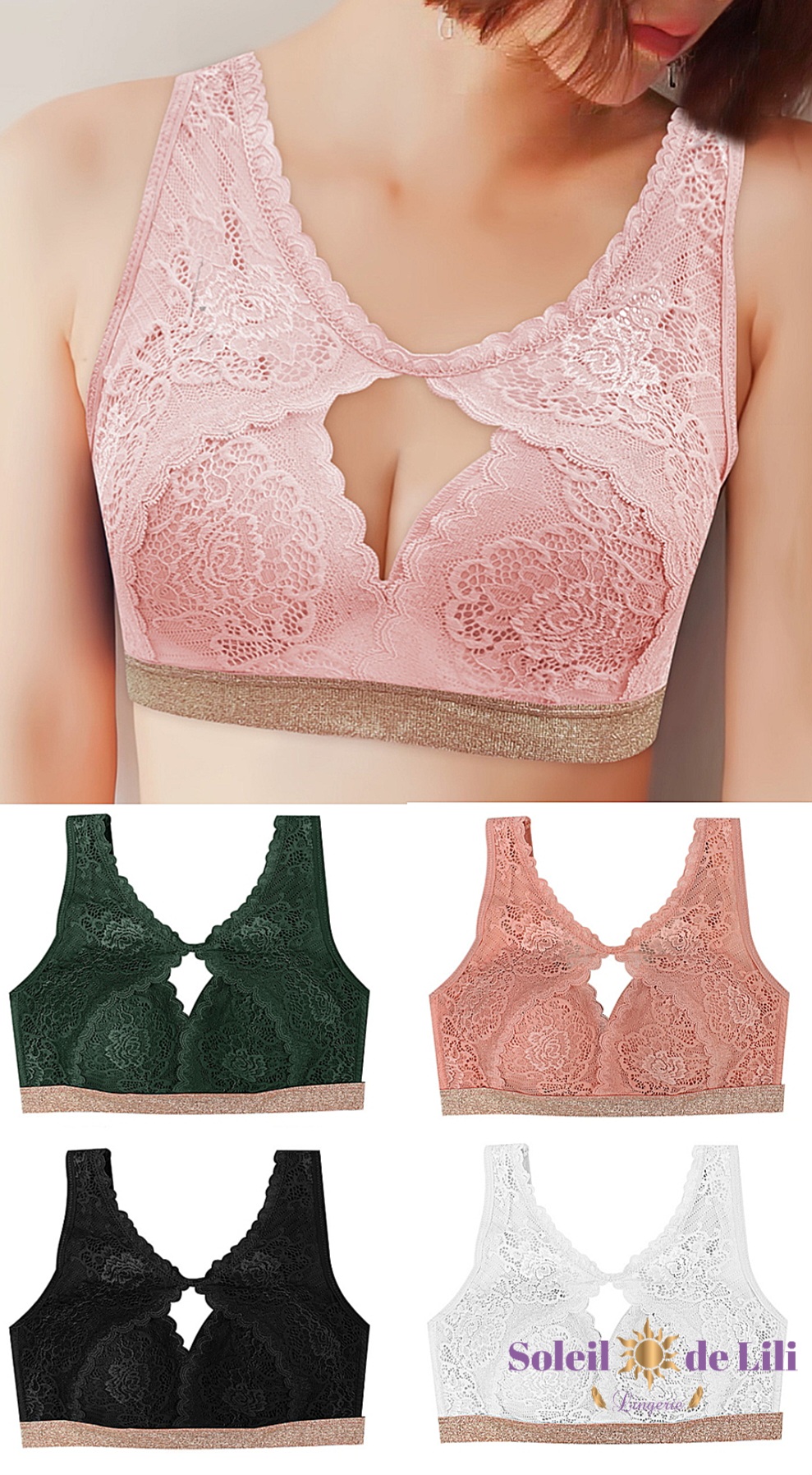 Nous vous proposons cette brassière crop-top en dentelle sans armature avec un liseret doré sous la poitrine qui lui apporte un maintien et un confort tout en souplesse. C’est un article incontournable lorsque vous désirez vous sentir à l’aise dans vos basquette tout en étant chic. L’ouverture lui confère un brin de sensualité. Cette brassière se décline en rose, noir, blanc et en vert foncé.