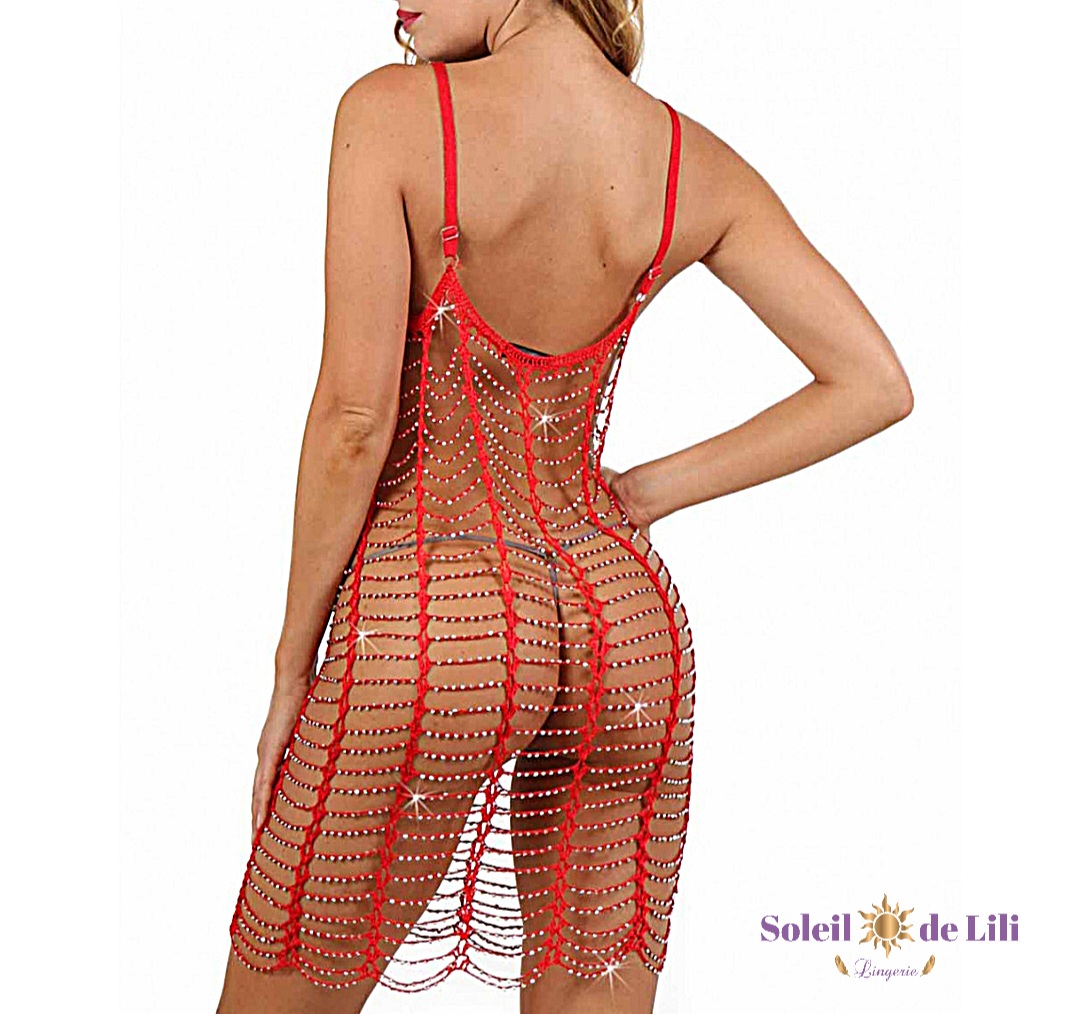 Nous vous proposons cette robe courte sexy, une pièce « must have » qui saura flatter votre silhouette. Une lingerie tout en séduction, glamour, sensuelle et sexy. Son tissus en maille noire, rouge ou blanc ornée de strass scintillants, joue délicatement avec la transparence pour révéler audacieusement vos courbes en les galbant harmonieusement avec un charme bohème et érotique. Cette tenue sexy toute en séduction s’enfile facilement et possède des bretelles ajustables. Elle est idéale dans des soirées coquines, avec votre partenaire ou à la plage et s’adapte à différentes morphologies.