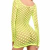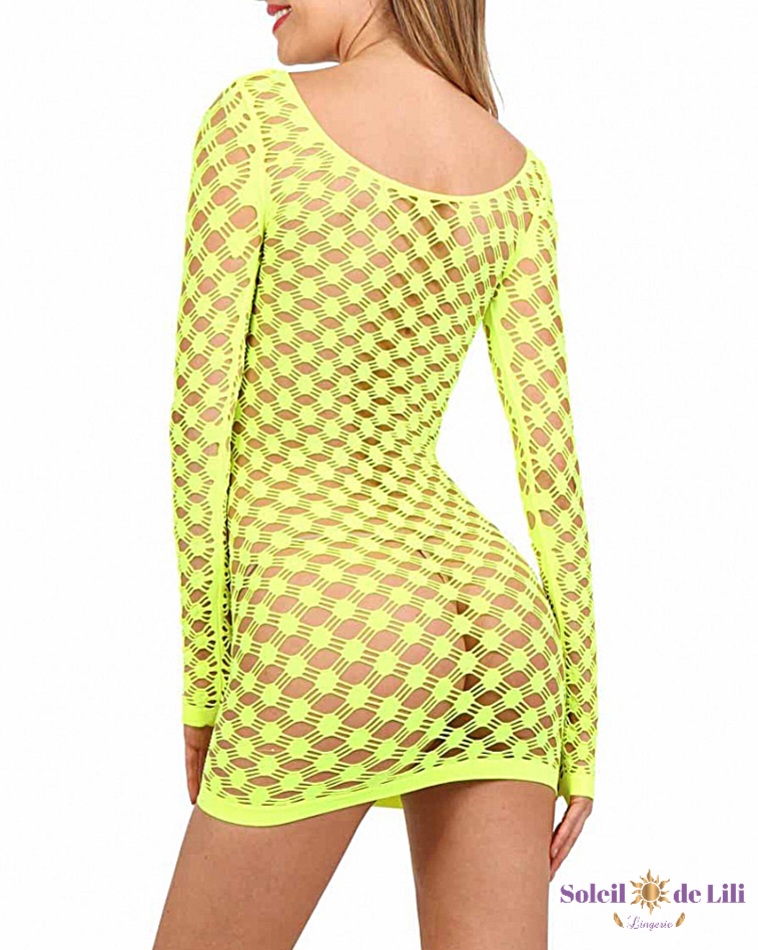 Nous vous invitons à découvrir cette tenue sexy sensuelle, c’est une robe en résille et filet aux motifs ajourés épousant armonieusesment les formes du corps. Son col large met parfaitement en valeur le décolleté. Cet article est très confortable et extensible. À porter sans modération en club, en